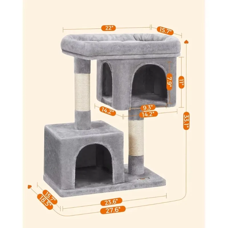Cat Tree Tower, 33.1-Inch Cat Condo for Large Cats up to 16 lbs. Large Cat Perch, 2 Cat Caves, Scratching Posts